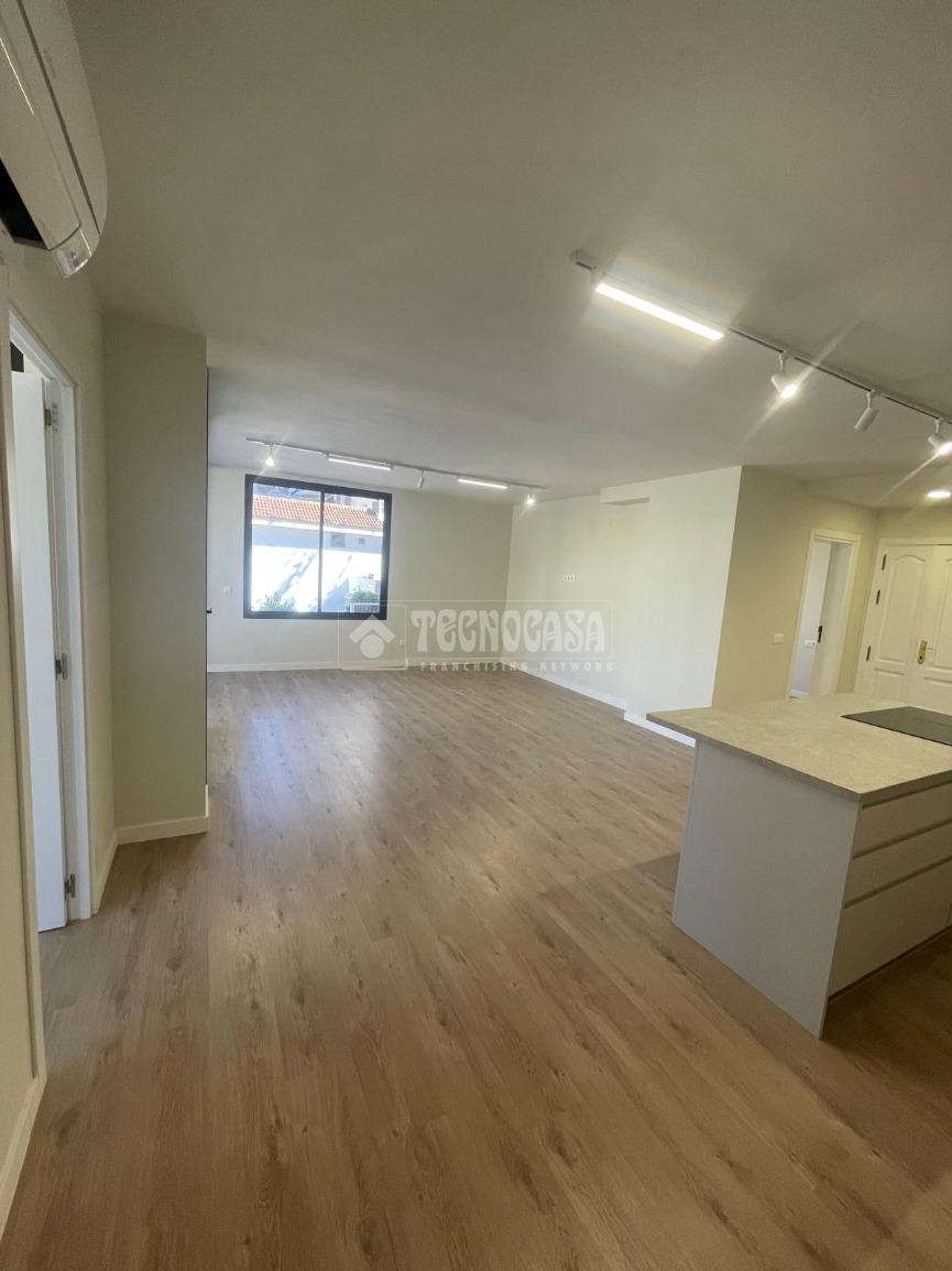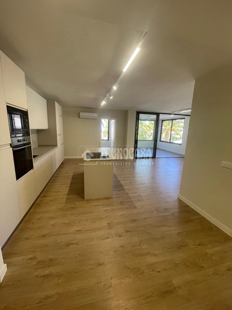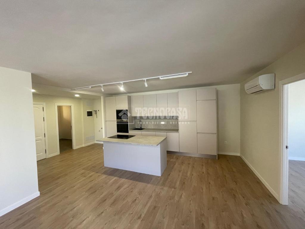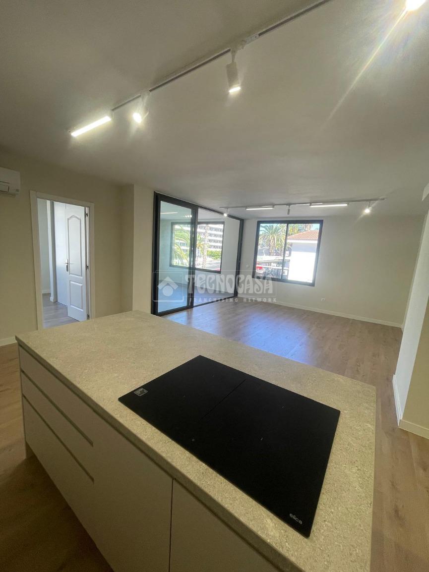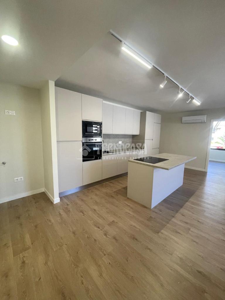 La vivienda dispone de dos habitaciones, armarios empotrados, lo que aporta amplitud y organización. El espacio principal integra salón y cocina en concepto abierto, destacando una cocina moderna con isla, completamente equipada con placa, horno y microondas nuevos, lista para estrenar.