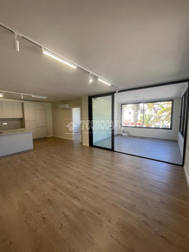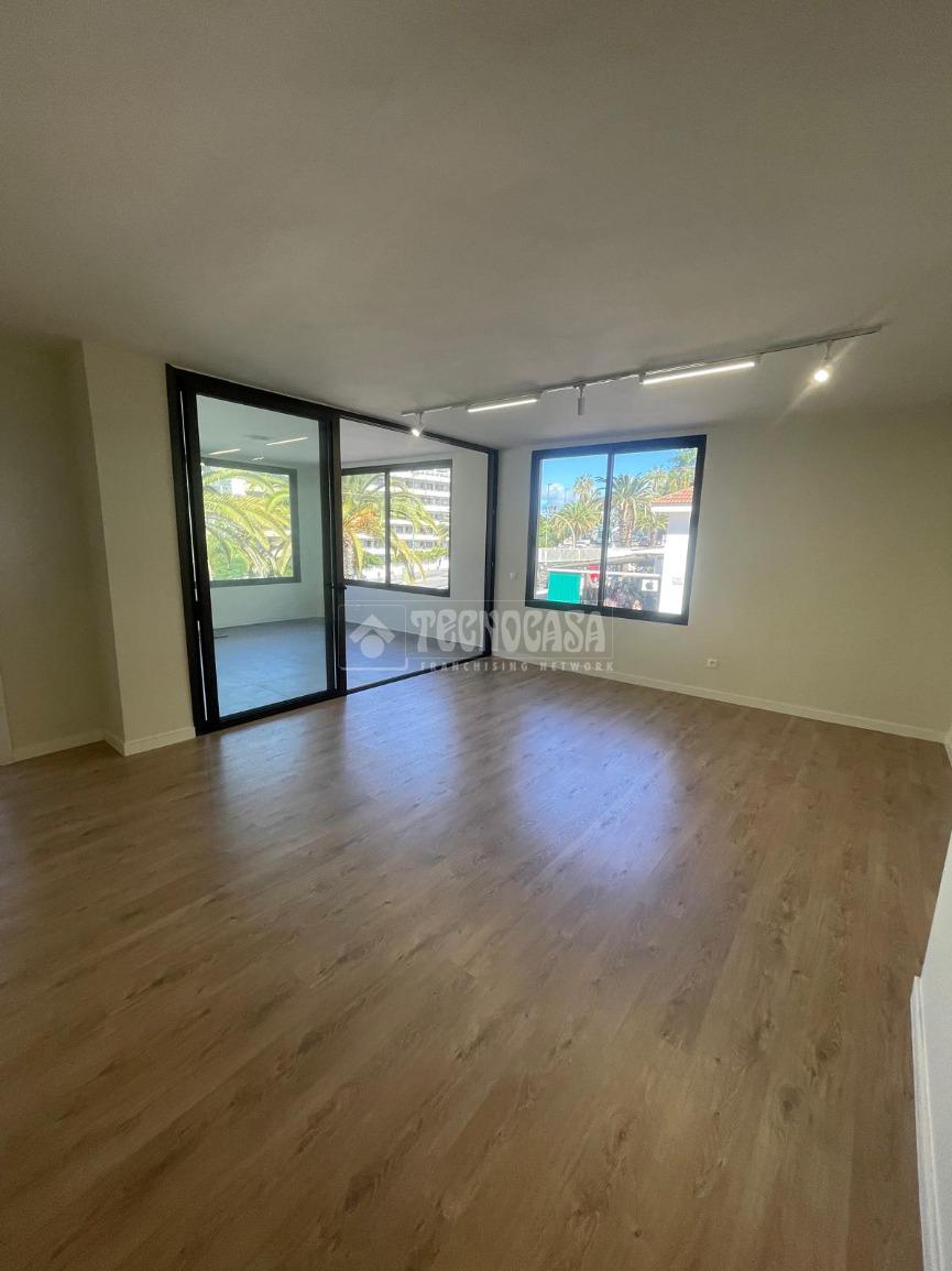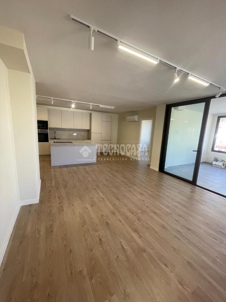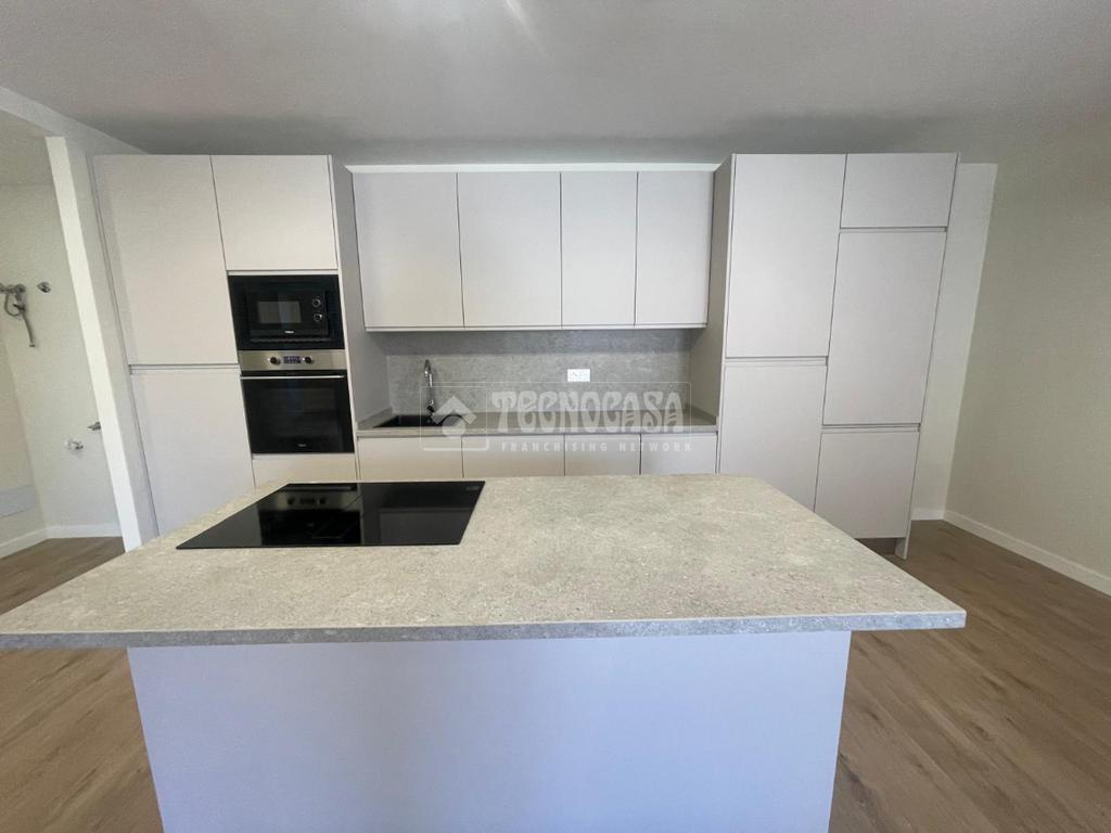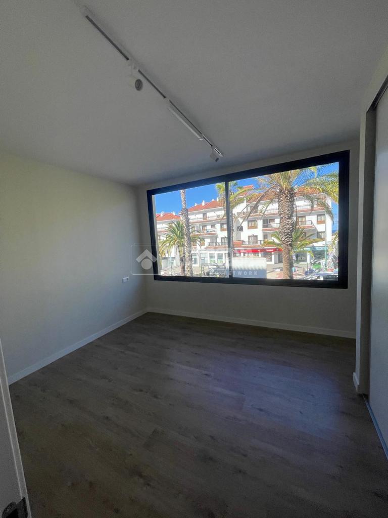 La vivienda dispone de dos habitaciones, armarios empotrados, lo que aporta amplitud y organización. El espacio principal integra salón y cocina en concepto abierto, destacando una cocina moderna con isla, completamente equipada con placa, horno y microondas nuevos, lista para estrenar.