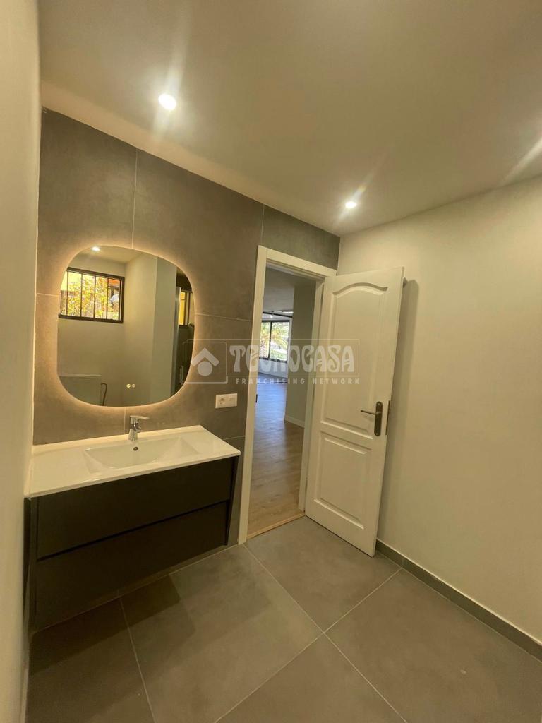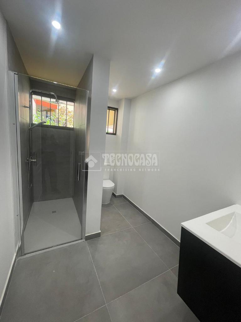 El baño ha sido reformado con materiales actuales, contando con un plato de ducha amplio y cómodo, siguiendo la línea contemporánea del resto de la vivienda.
